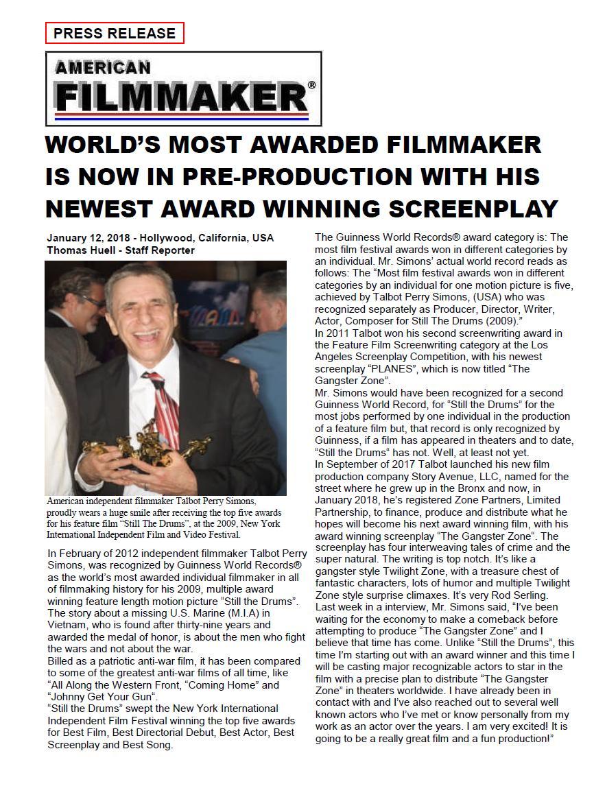 I would like to invite you to join me on a very exciting and worthwhile and potentially very profitable making venture, the production, marketing and distribution of my second feature length motion picture, "The Gangster Zone”, to be produced from my newest award-winning screenplay and the first of many films to be produced by Story Avenue, LLC.