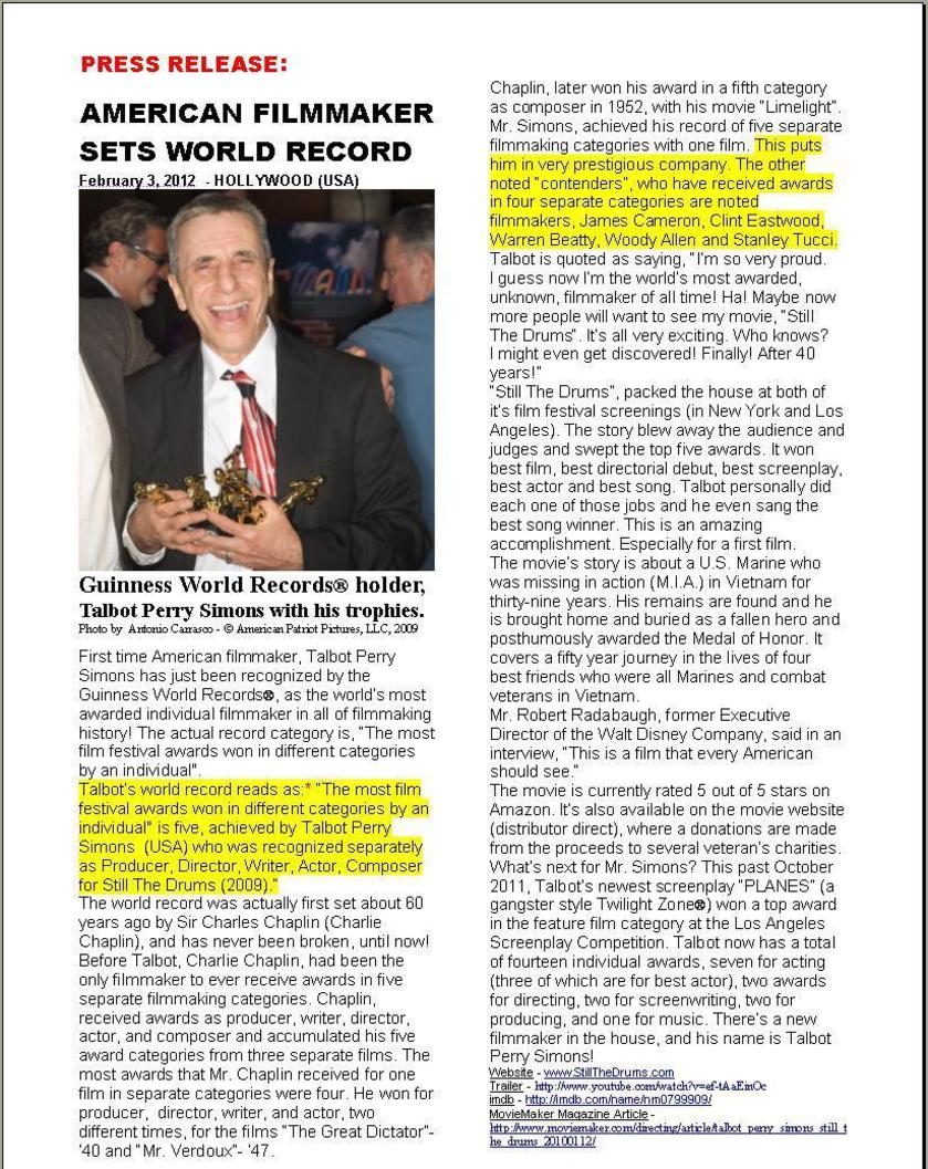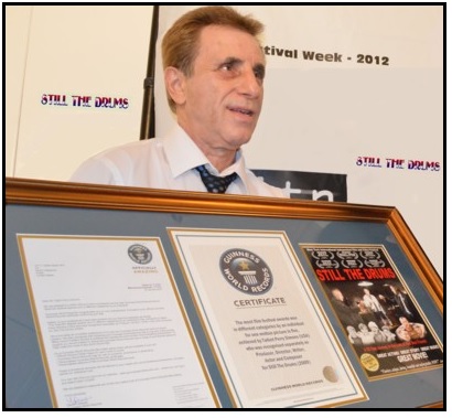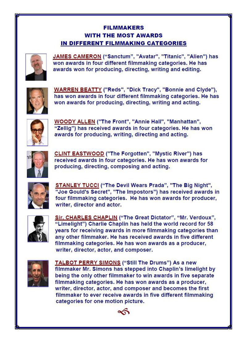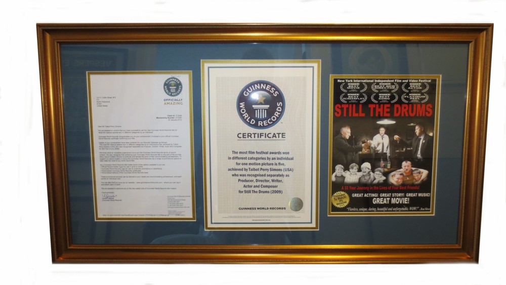But, just imagine how proud I am to tell you that as the writer, producer, director, composer and leading actor in “Still the Drums”, I set a new Guinness World Record in filmmaking. I broke Sir Charles Chaplin’s (Charlie Chaplin) sixty yearlong world record and I currently hold the new world record, as the only filmmaker in all of filmmaking history to personally receive awards in five different filmmaking categories for one motion picture. Other famous filmmaker contenders with awards in four filmmaking categories are, Clint Eastwood, James Cameron, Warren Beatty, Woody Allen, Stanley Tucci. Chaplin also had awards in five different filmmaking categories, but it took him two film to accomplish that.