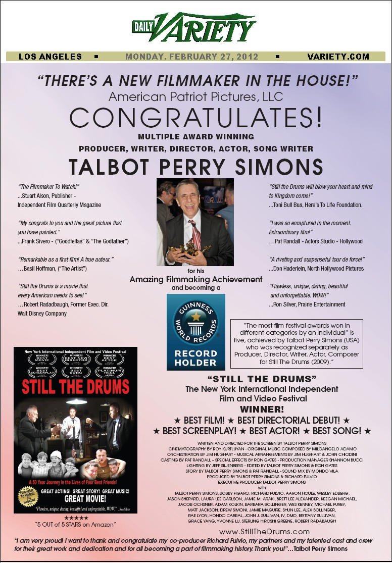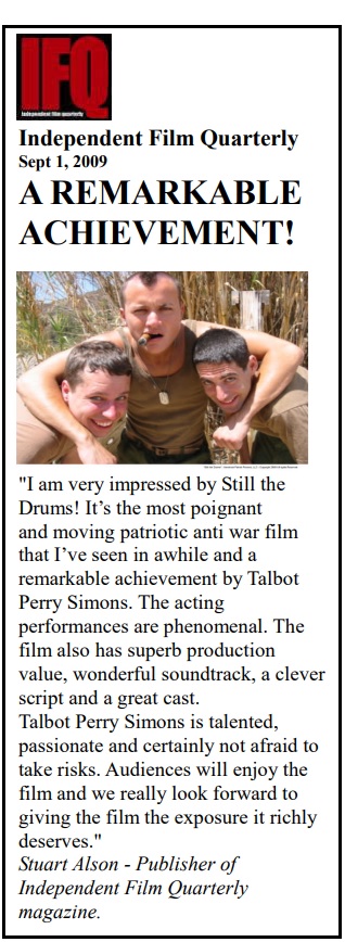Besides acting, writing, producing and directing Mr. Simons has also successfully worked in film finance with several successful Hollywood production companies assisting them in raising capital to finance their films. Using his acquired knowledge on the job, Talbot was able to personally create a film partnership and personally raise all of the funds to make his first feature length motion picture "Still the Drums".
